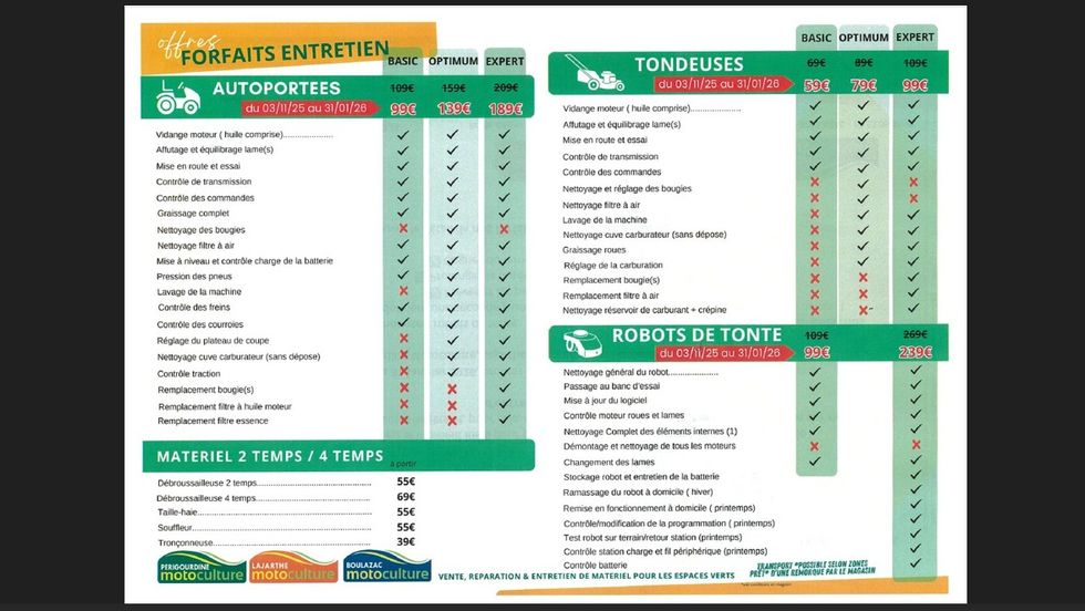 INSCRIPTION Vous trouverez ci-dessous nos offres de FORFAITS ENTRETIEN pour 2024 / 2025 Pour vous inscrire, veuillez nous contacter par TELEPHONE (voir ci-dessous les différents magasins) ou sur notre rubrique CONTACT ( voir ci-dessus ) Galerie Photo ‹ › × × Téléchargement pdf 868.29 Ko