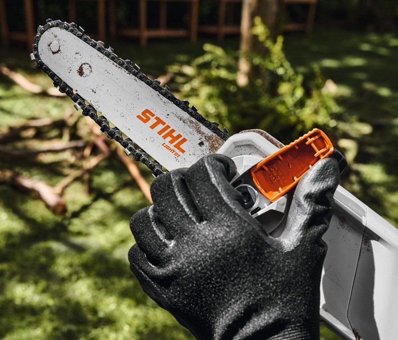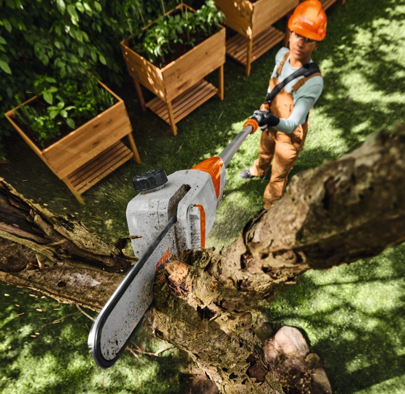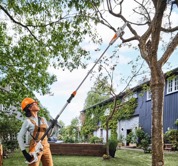 Avec arbre télescopique et tension automatique de la chaîne – pour un entretien des arbres efficace et confortable sur les propriétés privées